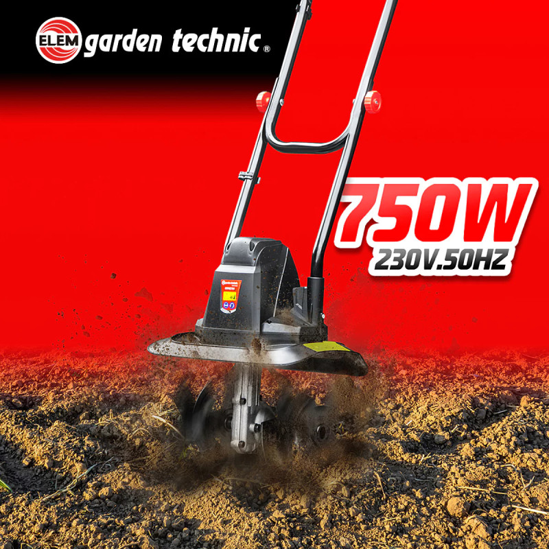 La motobineuse Elem Garden Technic MTBE754 230V, 750W est une petite motobineuse électrique compacte et légère. Avec 750W et 4 fraises, elle offre 32 cm de largeur et 20,50 cm de profondeur de travail. Parfaite pour biner entre les rangs et entretenir un petit potager.